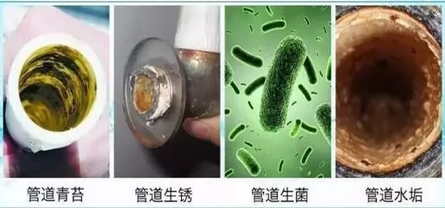 自來水的主管道內的自來水流量大、流速快以及水壓大不同,而家居水管彎折位多,自來水在進入每一戶住宅的管道后,人們每天用水時間綜合起來平均不到4小時,隨著自來水在用戶管道內滯留時間的增長,導致水中余氯含量迅速減少,濁度、色度、鐵、錳、鉛、鋅、溶解性總固體、細菌等指標升高,它們在細菌的作用下干結、腐敗、發酵。日積月累,會形成厚達5-7毫米的不同顏色、惡臭、有毒對身體健康有害的物質,并牢牢地黏連在水管壁上,所以這些沒有清洗過的水管,形同患癌一樣,又稱為毒管。